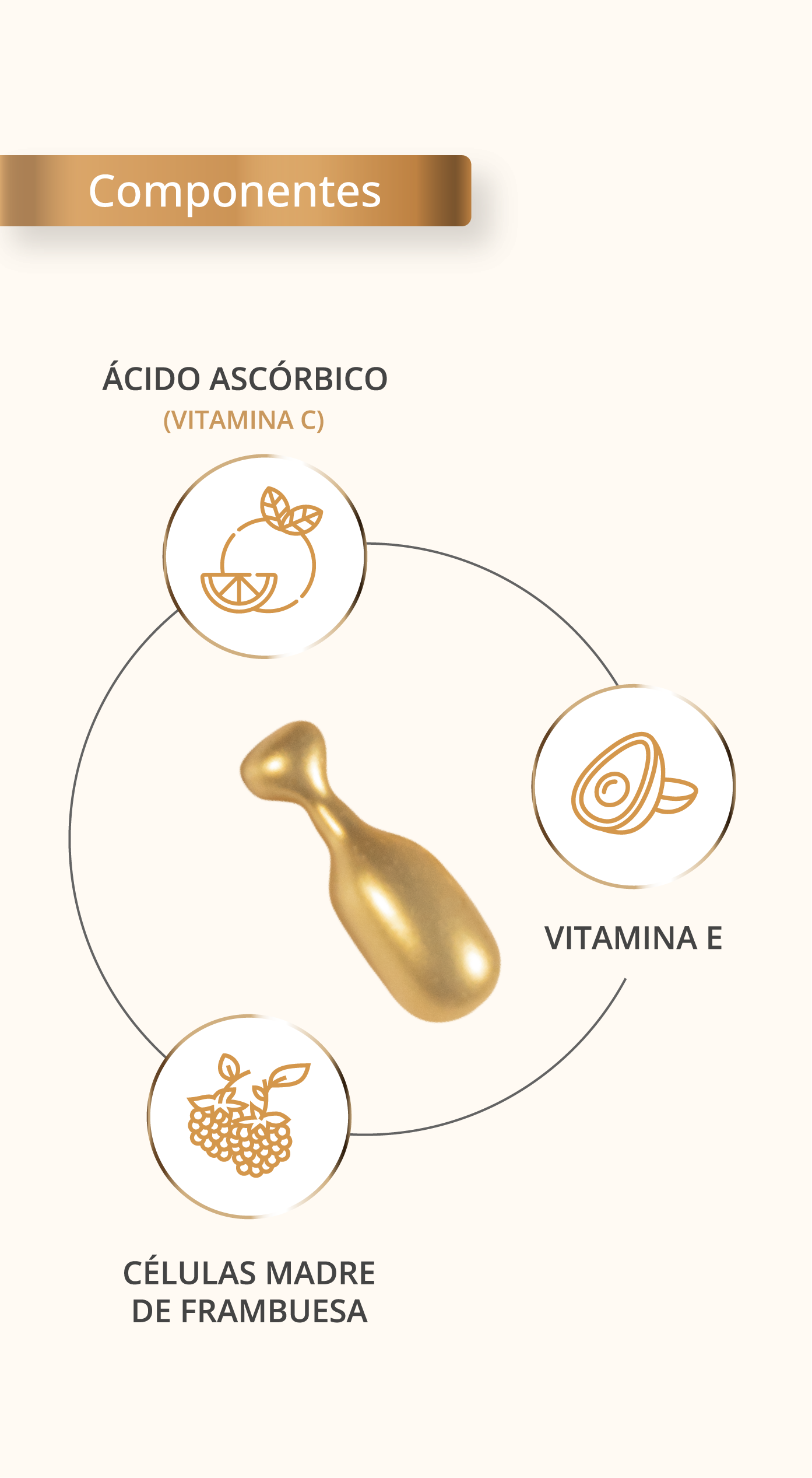 Es una crema en cápsulas twist off formulada con Vitamina C al 20% pura y estable + Vitamina E + Células madre de frambuesa. Debido a su alta concentración de Vitamina C, es un shock concentrado de alta calidad.