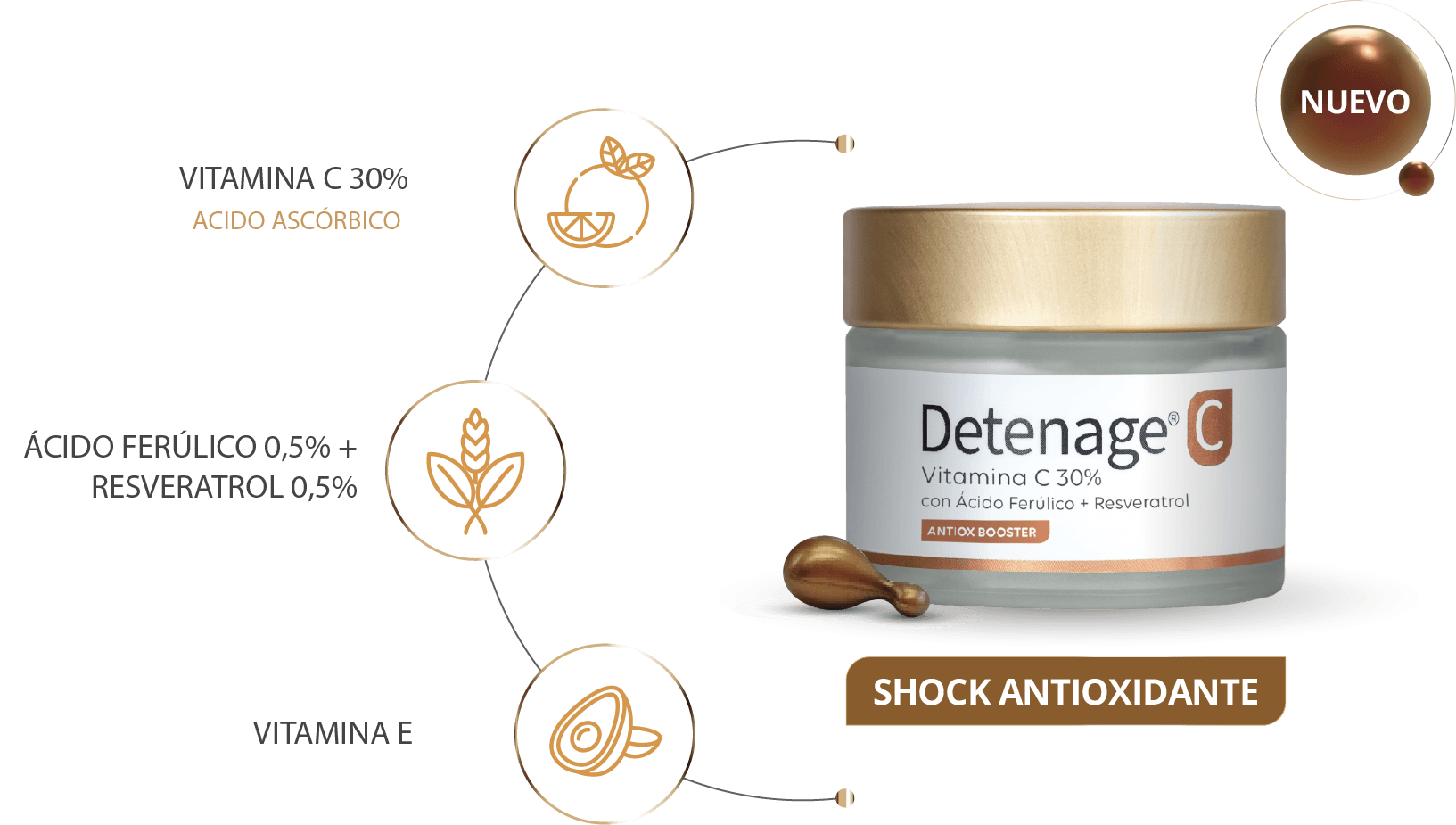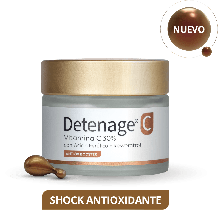 Detenage C 30%, potenciada con Ácido Ferúlico, Resveratrol y Vitamina E, ofrece un shock antioxidante intensivo para pieles con signos visibles de fotoenvejecimiento como manchas, opacidad o arrugas incipientes. Su sinergia de alta potencia unifica el tono, potencia la luminosidad y refuerza la defensa antioxidante de la piel.