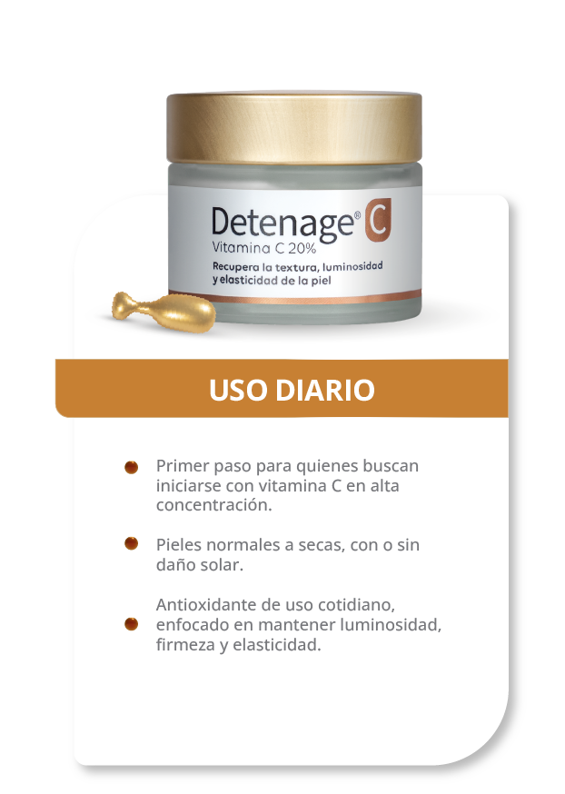 Detenage C 20%, potenciada con Vitamina E y Celulas madre de frambuesa, indicada para uso diario, es el primer paso ideal para quienes buscan iniciarse en altas concentraciones de Vitamina C. Ayuda a mantener la luminosidad, la firmeza y la elasticidad, actuando como un antioxidante cotidiano de alta calidad.