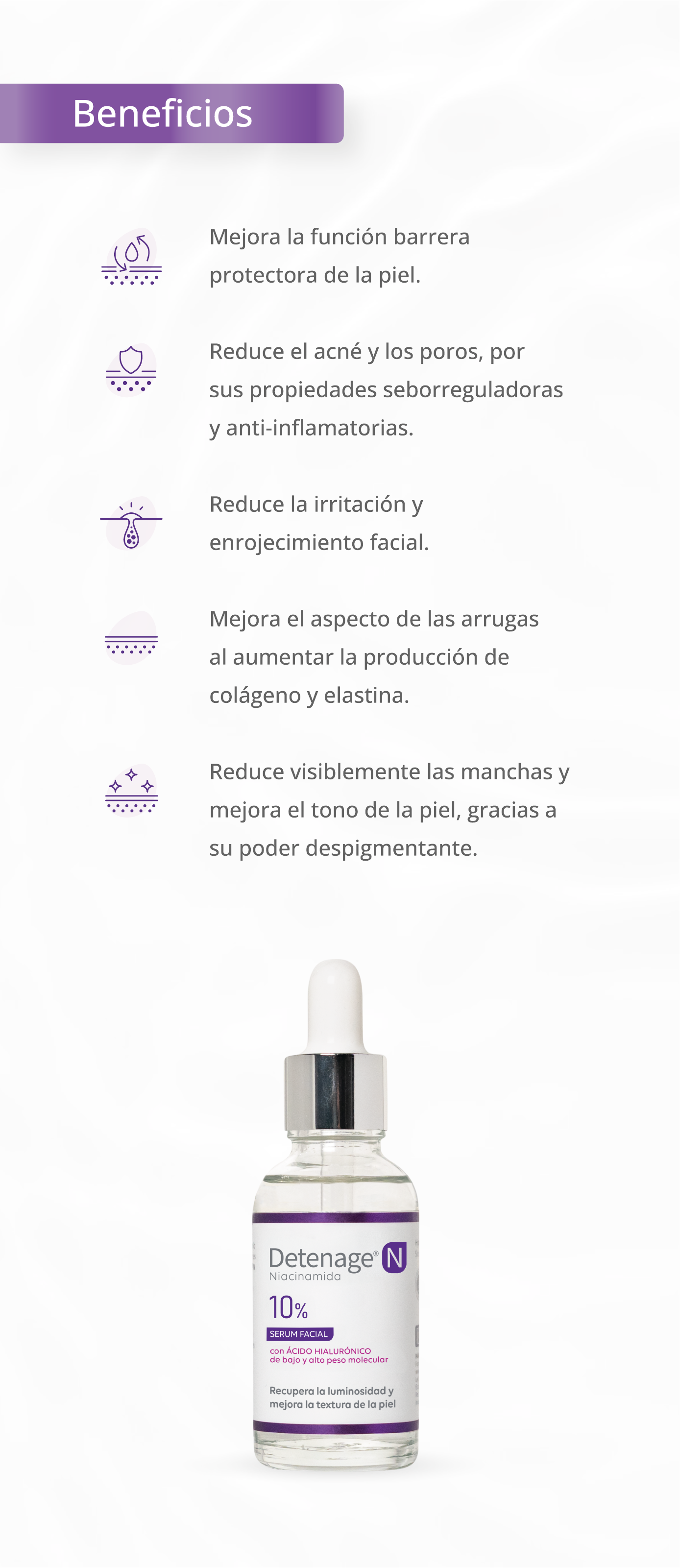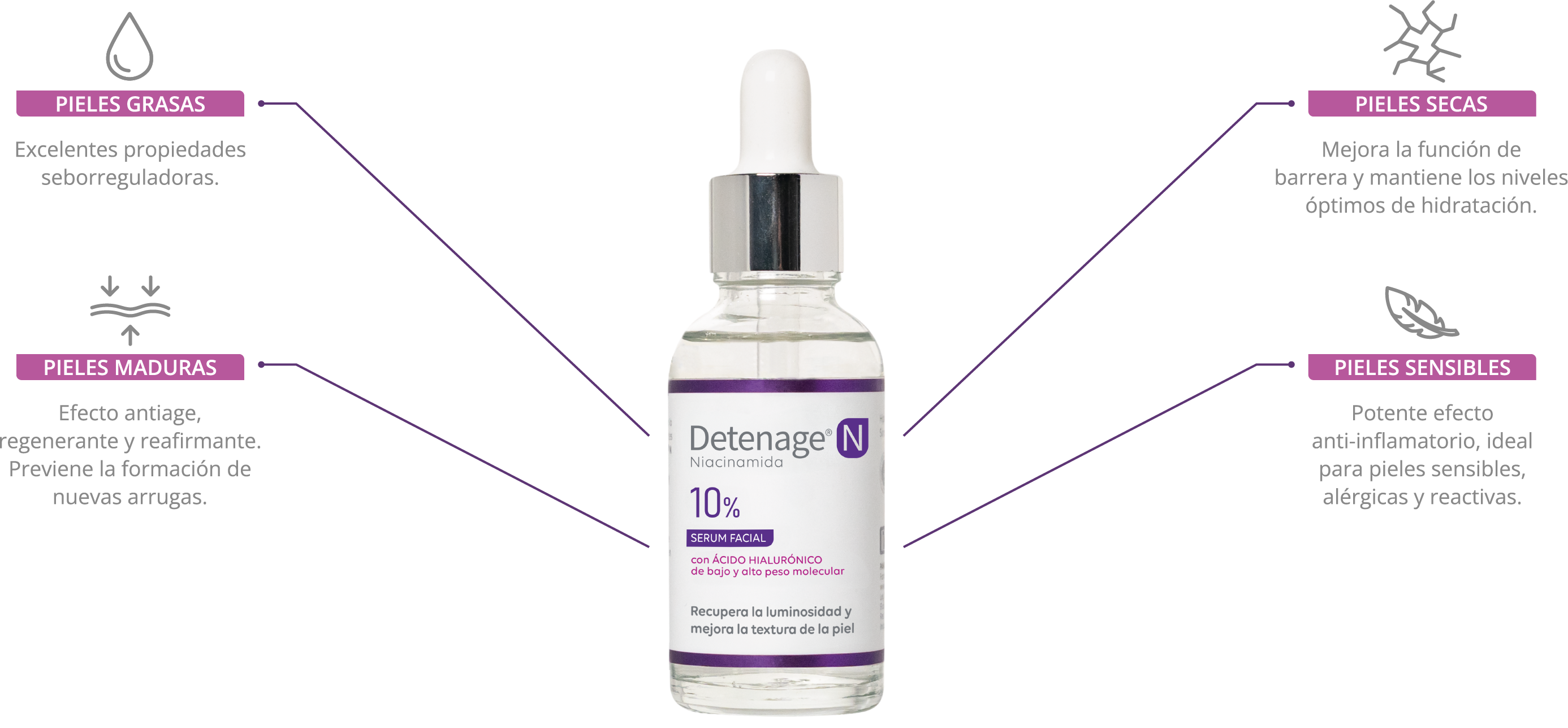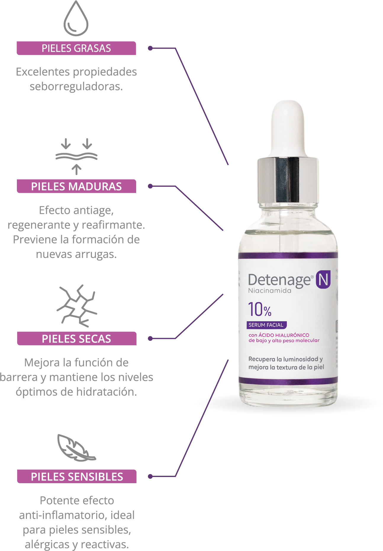 Detenage N Serum facial ha sido desarrollado para todo tipo de piel, incluso pieles grasas, acneicas, con manchas, rojeces o envejecidas.
