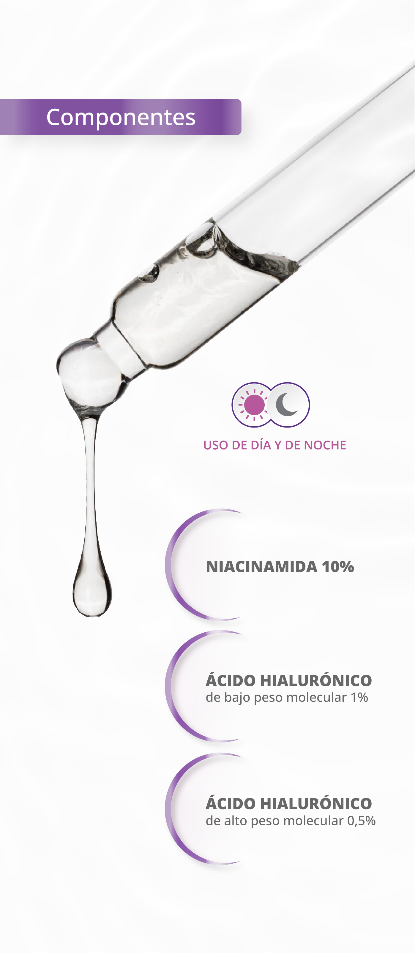 Posee una innovadora fórmula con Niacinamida al 10% y dos formas de Ácido Hialurónico puro: de bajo peso molecular al 1% y de alto peso molecular al 0,5%.